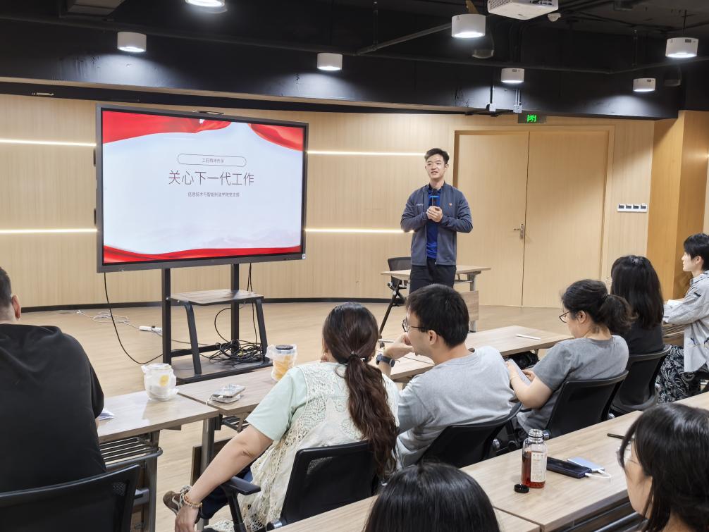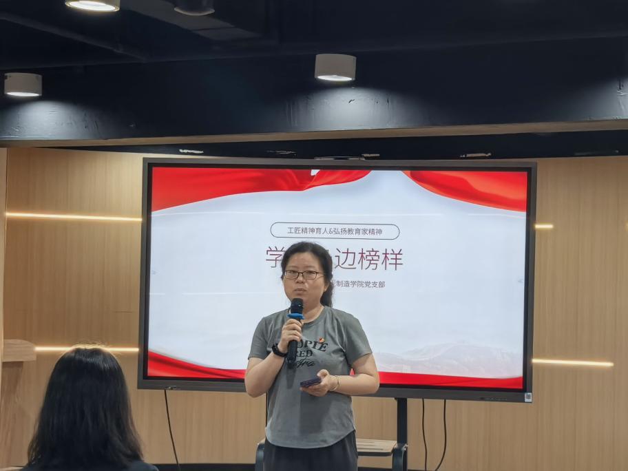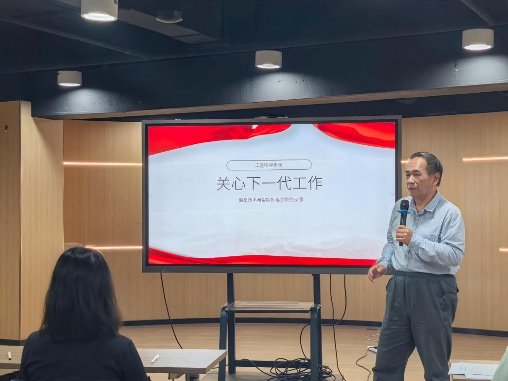 在主题分享环节,关工委副主任朱老师围绕 “如何践行匠心育人,如何弘扬教育家精神” 展开精彩讲述。朱老师结合自身丰富的教育经验,从师德师风建设、教育教学创新等方面深入阐述,强调教育工作者要坚守育人初心,以匠心致初心,以爱心育桃李。学生委员周羽喆也分享了自己在学习与成长过程中的感悟,展现了新时代青年学子积极向上的精神风貌和对党的忠诚与热爱。