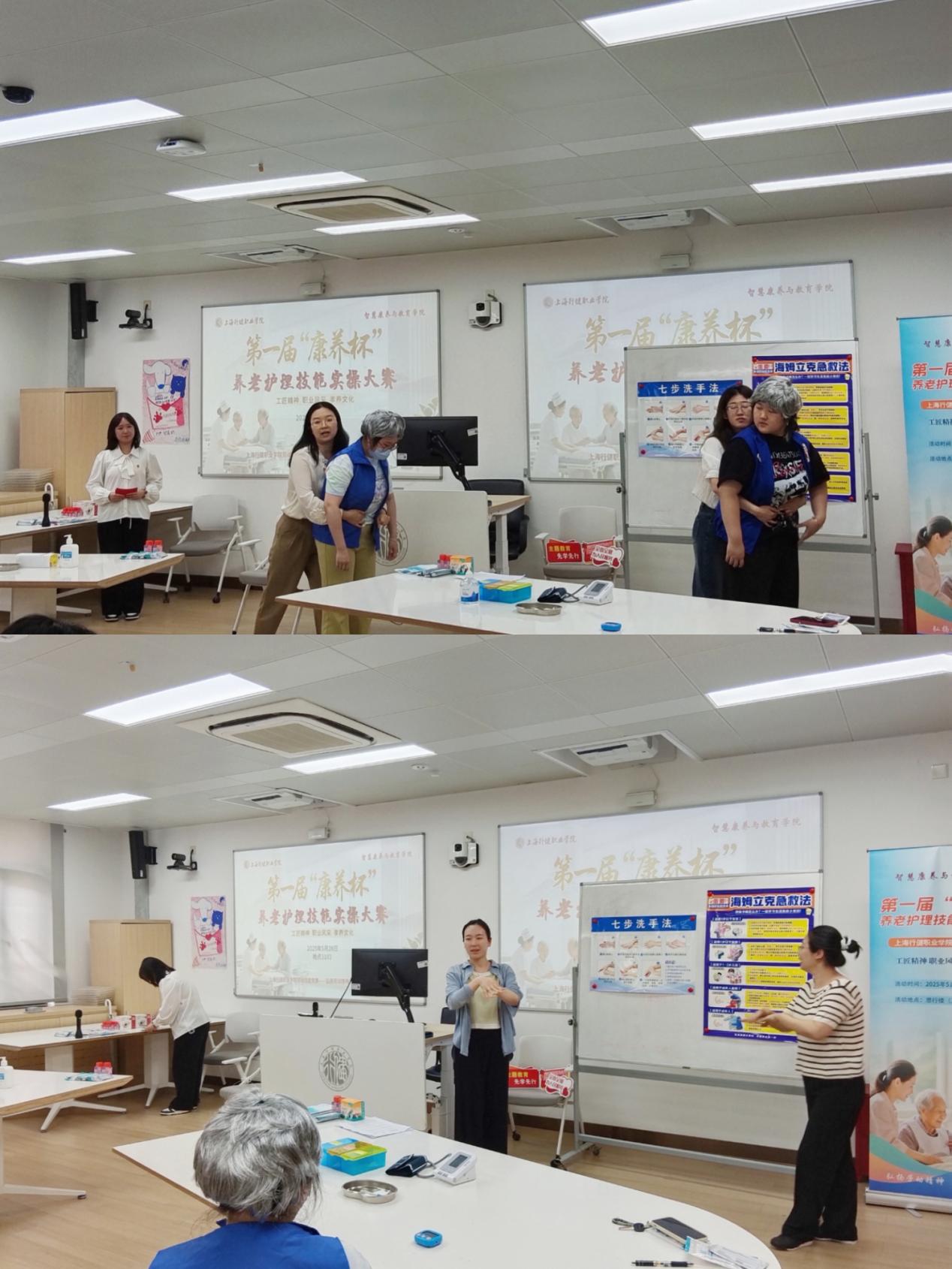 2025年5月,支部组织党员教师及入党积极分子开展 “党建+志愿服务” 系列活动。在“以技能践行初心,用行动为民服务”活动中,党员教师们担任急救先锋,在安博(中国)养老护理技能实操大赛现场演示海姆立克急救法和七步洗手法。同时,承担赛事多岗位志愿服务工作,以实际行动帮助学生提升养老护理技能。