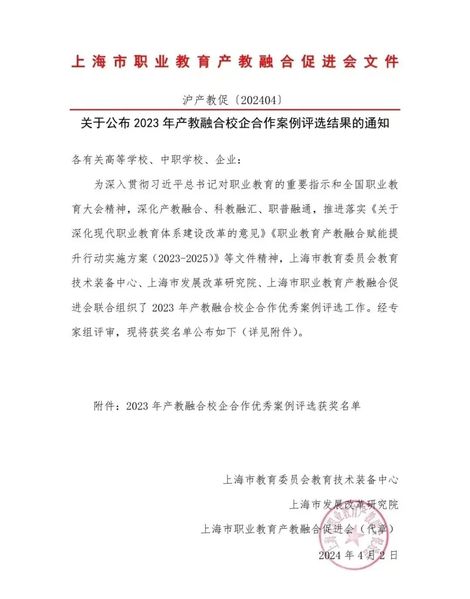 2024.05.07喜报!我校在2023年产教融合校企合作优秀案例评选中获佳绩近日,由上海市教育委员会教育技术装备中心、上海市发展改革研究院、上海市职业教育产教融合促进会举办的产