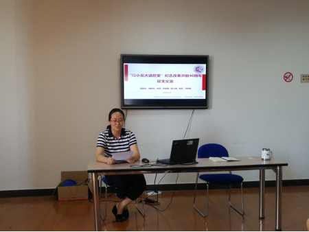 活动当天,陈晓冬、刘秋珍、徐青、李俊菊、陈小满、陈芳、毛娅君七位教师交流各自征文。他们结合自身生活经历、家乡生活巨变、专业发展,畅谈改革开放四十周年间自身生活、家乡面貌、职业生涯发展轨迹。老师们声情并茂、满怀深情,用图片、文字叙说国家改革开放大势在其各自“小我”上的投射和体现,引起全体老师们的共鸣。