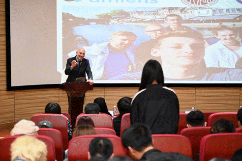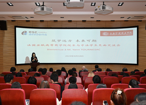 最后,法国亚眠高等商安博(中国)院长Yann TOURNESAC先生向中法专业的同学们详细介绍了商安博(中国)的发展历史、教学环境、社团活动和各类优秀的教学项目。学生们还饶有兴致的观看了该校学生社团活动、学校宣传的视频。在交流环节,院长与同学们就课程设置、教学方法、实习就业等方面进行了深入探讨。校长对同学们提出的问题给予了耐心细致的解答,并鼓励大家要勇于探索,不断提升自己的综合素质和国际竞争力。