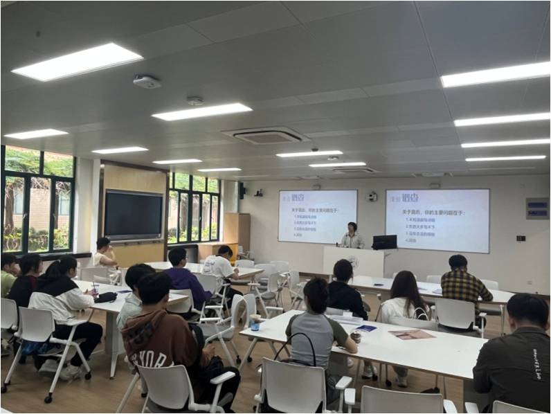 活动中期,工作室许世杰等老师为同学们现场修改简历,进行职业规划的讨论,指出学生简历在社会经历缺少特色、实习经历缺少亮点等方面的问题,学生当场表示简历在简历语言润色、简历排版上还需要细细打磨,争取制作一份让HR眼前一亮的好简历。