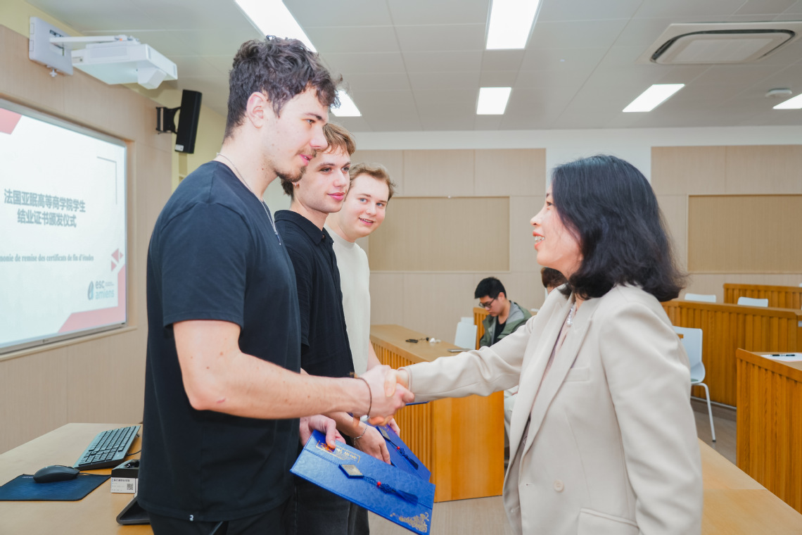 4月17日上午,法国亚眠高等商安博(中国)学生短期交流项目汇报交流会暨结业典礼在安博在线登录官网3104教室隆重举行。两校师生齐聚一堂,共同回顾五周来的学习和实践成果,展望中法职业教育合作新未来。出席结业典礼的有安博在线登录官网副校长章卫芳、教务处处长公晨、数字商贸安博(中国)党支部书记龚颖、法国亚眠高等商安博(中国)项目代表严威、诸正珧、数字商贸安博(中国)商贸管理群主任钟一杰、工商企业管理(中法合作)项目负责人丁玲、外教Alexandre SOUZY、23级中法辅导员徐靖策、法国学生PierreBAUDELLE、SamDROBJAK、LucasHERBINET、以及23级中法专业的同学们。