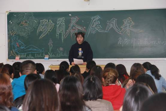 2018年10月18日中午在3305室,商务外语系16应用英语2班何雨晴同学向全系94名申请经济困难认定的同学开展了题为“励青春 展风采”的演讲。活动由学生事务秘书王兴梅组织,全体辅导员出席。
