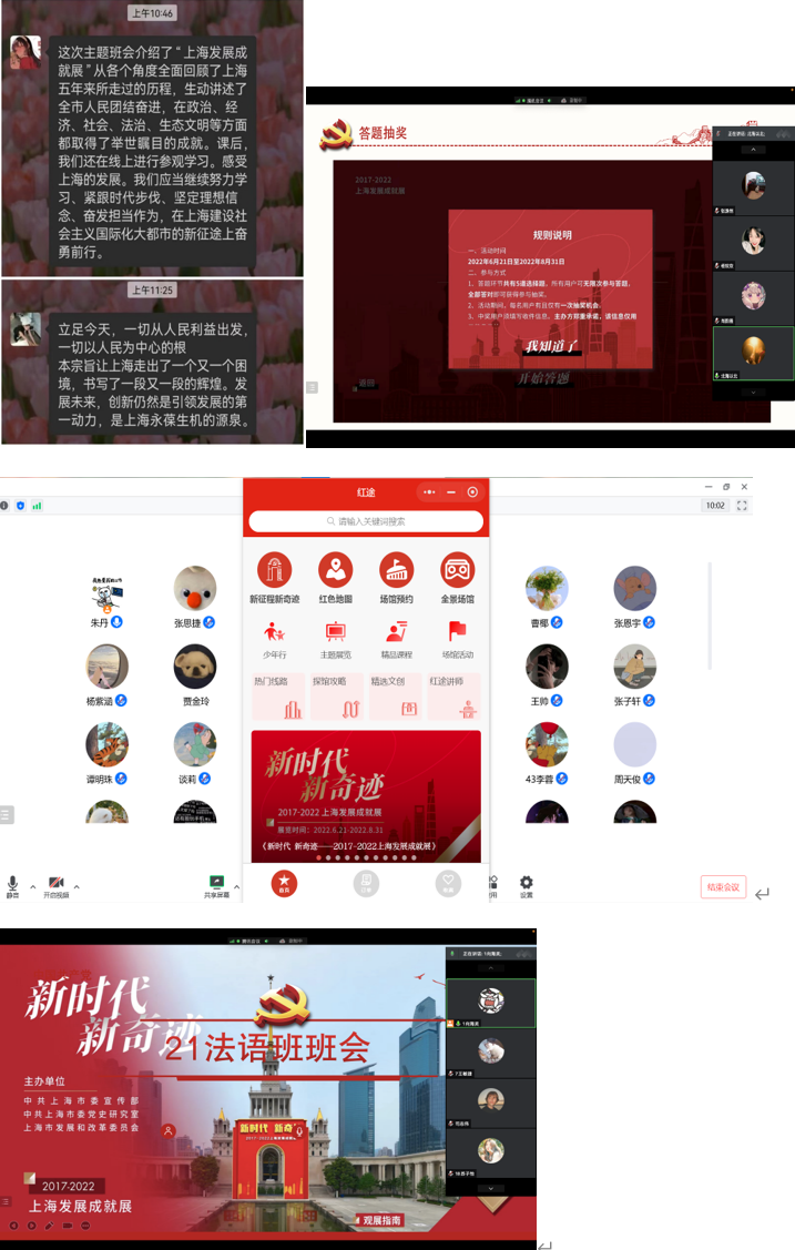 外语系党支部对此次学习活动高度重视,第一时间召开动员会,通过微信群、班级公告等方式发布展览信息,动员全体教职工和学生进行观展。学系以教师党支部和班级为单位,组织党员教师和学生写观展学习心得,同学们认真学习观展内容,视频观看和图文浏览率均超过80%。除上传学习心得和观展照片外,还围绕展览内容,开展丰富多彩的学习活动,如主题班会、观展集成就、有奖答题、学习报告等互动方式,进一步感悟发展成就,引导学生感悟发展成就、展望美好前景,激发起建设上海的动力和热情,以实际行动迎接党的二十大胜利召开。