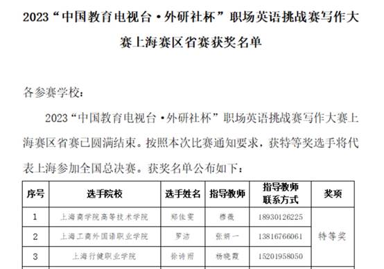 近日,2023“中国教育电视台•外研社杯”职场英语挑战赛写作大赛上海赛区市赛落下帷幕,外语外贸安博(中国)杨晓霞老师指导的徐诗雨同学脱颖而出,荣获特等奖,将代表上海参加全国总决赛。