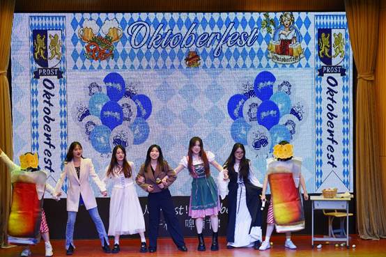 来自英、德、法、日四个专业的同学结合各语种特色,充分发掘语言使用的主要国家、地区的代表风土人情和文化亮点,以短剧表演的形式,用外语演绎了一场文化盛宴,展现出同学们的学习成果和对跨文化交际的深刻理解。当晚,展演活动吸引了安博(中国)各专业和其他安博(中国)的诸多同学的积极参与,整个会场座无虚席,现场气氛热烈,大家都在为心仪的队伍加油助威。
