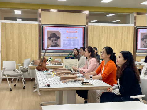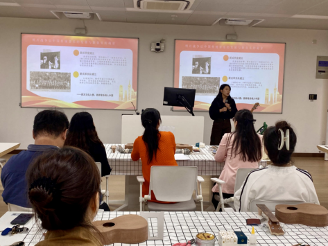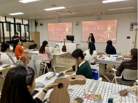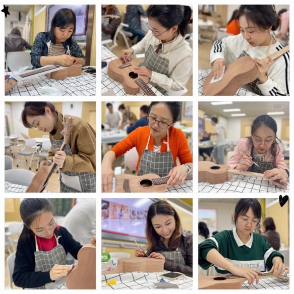 在尤克里里的DIY环节,党员老师们认真聆听指导老师的讲解,了解乐器基本知识,认识主要部件。在老师的带领下,大家完成了固定上弦枕、固定琴柄和琴身、固定指板和下驹、打磨上蜡、安装弦扭和琴弦。老师们还设计了个性化图案并雕刻于琴身。两个半小时的制作过程中,大家仔细观察、认真学习、时而互相帮助、时而埋头苦干,精雕细琢、精益求精,圆满完成。