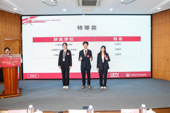 师生配合默契,他们的努力和付出,在比赛现场得到了充分的回报。朴惠兰在现场凭借流畅地道的英语表达、深入浅出的论述和自信从容的表现,赢得了评委和观众的一致好评,荣获特等奖第一名。唐泽澍同学的视频也以其独到的见解和出色的演讲技巧,荣获二等奖。