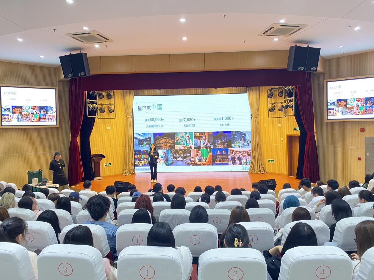 4月21日,首场宣讲会拉开帷幕。上海星巴克咖啡经营有限公司人事总监侯佩岚走进1109会议室,为240名学生带来精彩分享。侯总监详细介绍企业发展历程、文化、产业布局及订单班签约模式,为订单班学生提供实习机会与就业岗位。