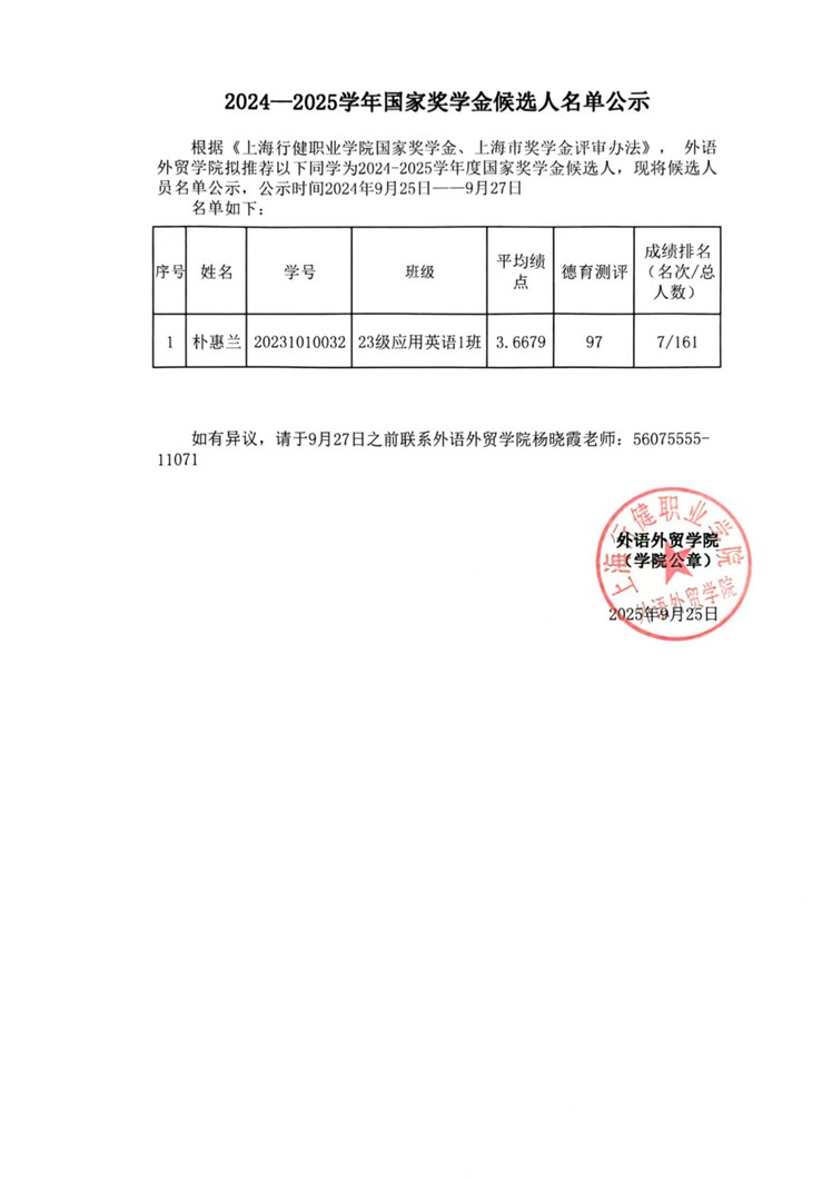 2024—2025学年国家奖学金候选人名单公示
