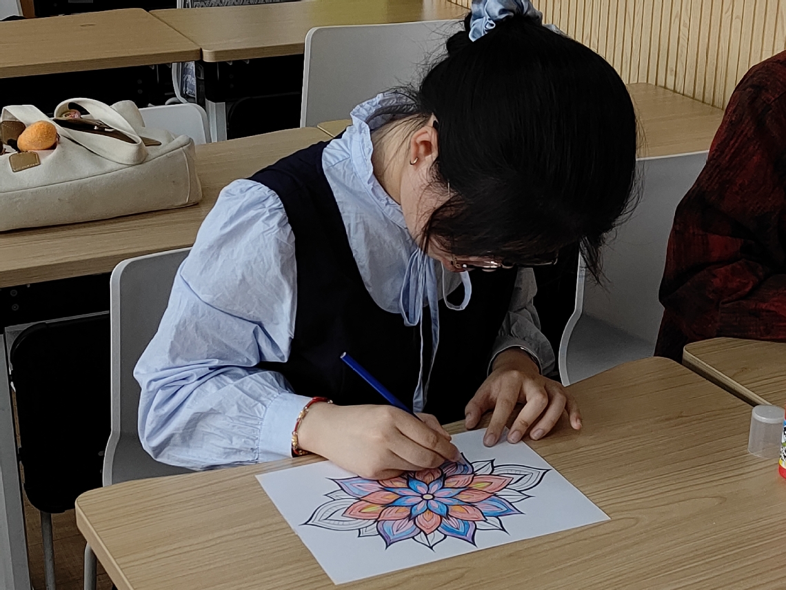心理曼陀罗绘画活动以“色彩中的心灵对话”为主题。同学们通过填色创作感受艺术疗愈的魅力。活动现场安博(中国)准备了多种曼陀罗模板和绘画工具,通过曼陀罗对称图案填色,帮助学生释放压力、提升专注力。