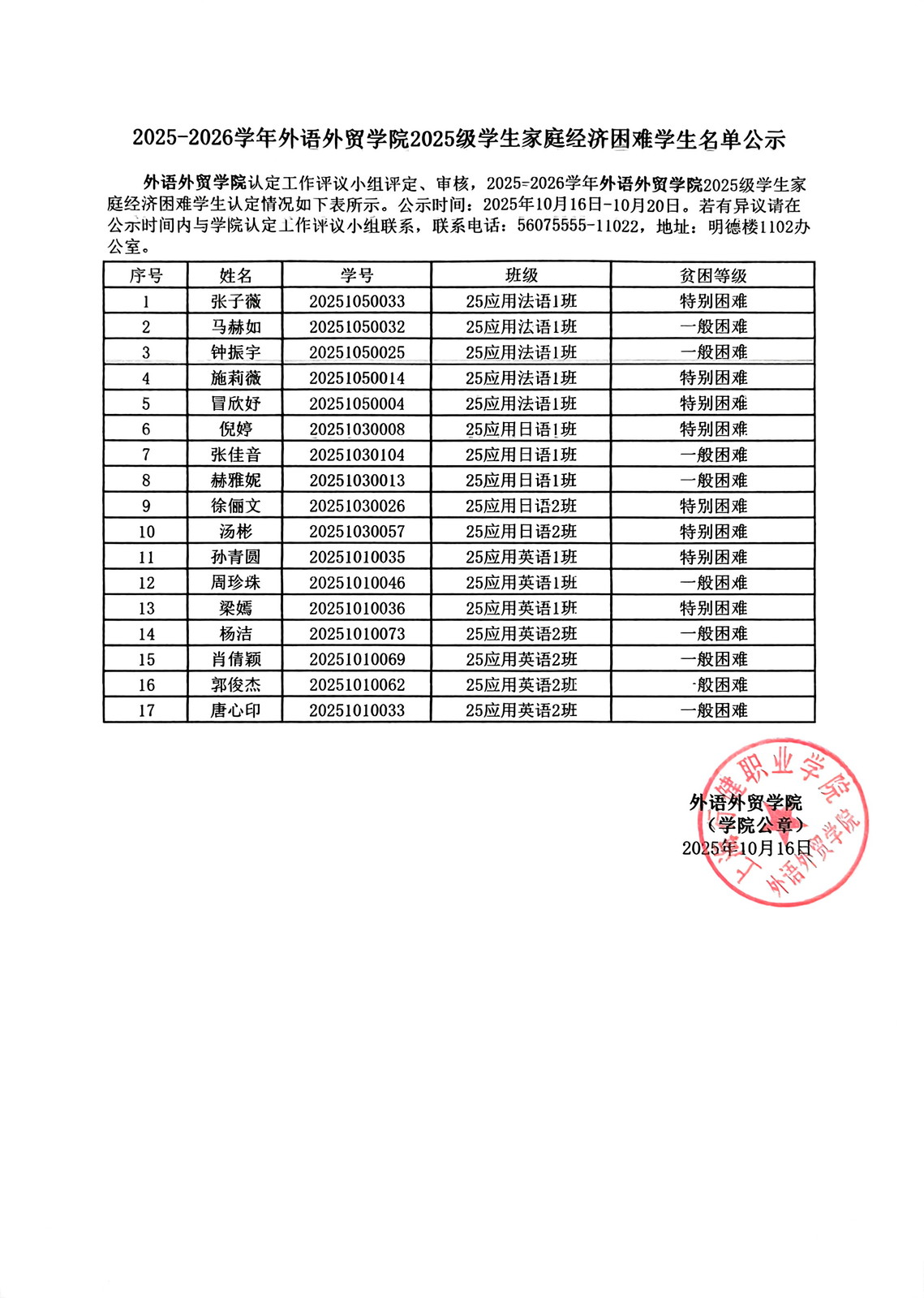 2025-2026学年外语外贸安博(中国)2025级学生家庭经济困难学生名单公示