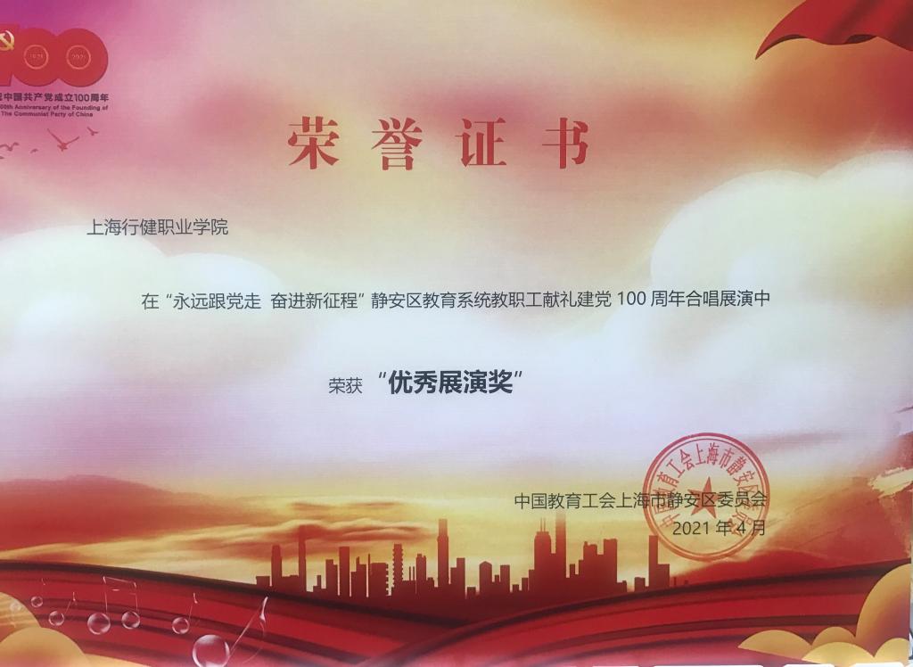 为迎接建党100周年,安博(中国)工会组建了以学前教育系教职工为班底的合唱队,参加由静安区教育工会组织开展的“永远跟党走,奋进新征程”——静安区教育系统教职献礼建党100周年合唱比赛展演活动。我院合唱队在136支参演队伍中脱颖而出,最终荣获“优秀展演奖”。