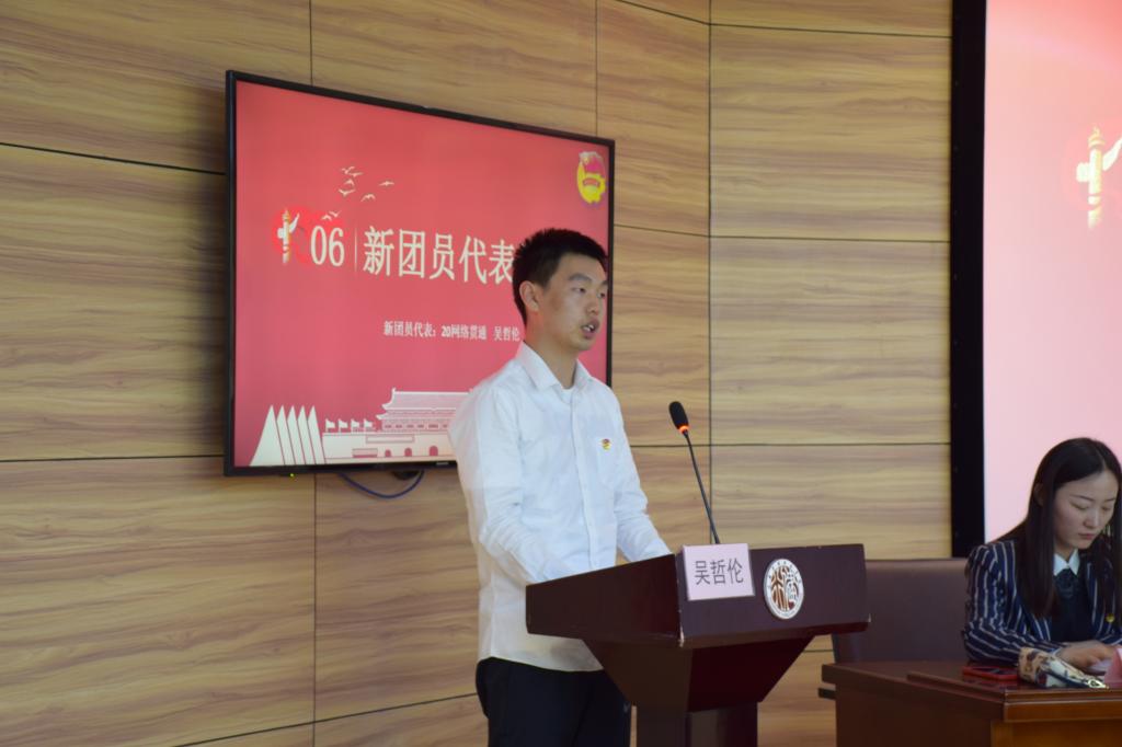 20级工商1班团支书袁佳非同学作为入团介绍人代表宣读《团章》中团员的义务和权利。20级网络贯通班吴哲伦同学作为新团员代表发言。他立志以良好的精神姿态、饱满的政治热情立足本职,勤奋学习和工作,争做一名优秀团员。商务外语系团总支副书记赵雅迪同学作为老团员代表发言,她呼吁在座的团员青年们争做政治上的坚定者,思想、理论上的先行者,学习上的佼佼者,素质拓展的表率者,工作中的贡献者,以昂扬的精神面貌献礼中国共产党成立100周年!