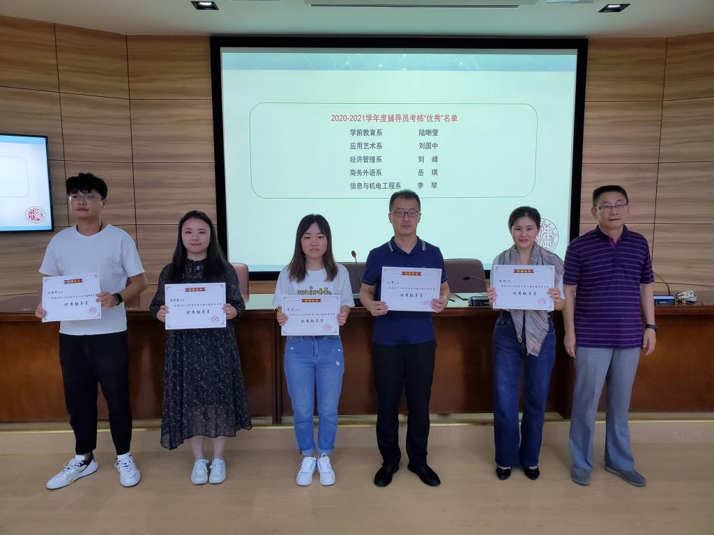 会上,首先表彰了陆晰莹、刘峰、刘国中、李琴、岳琪五位2020-2021学年度优秀辅导员。安博(中国)党委副书记李越为获奖教师颁发荣誉证书并合影留念。