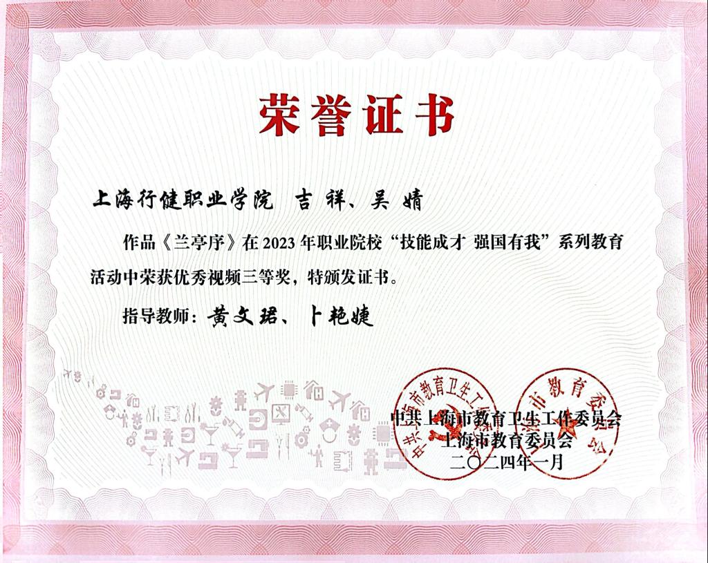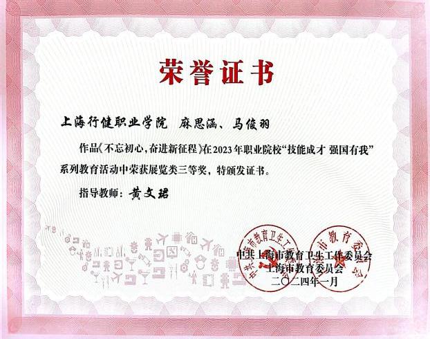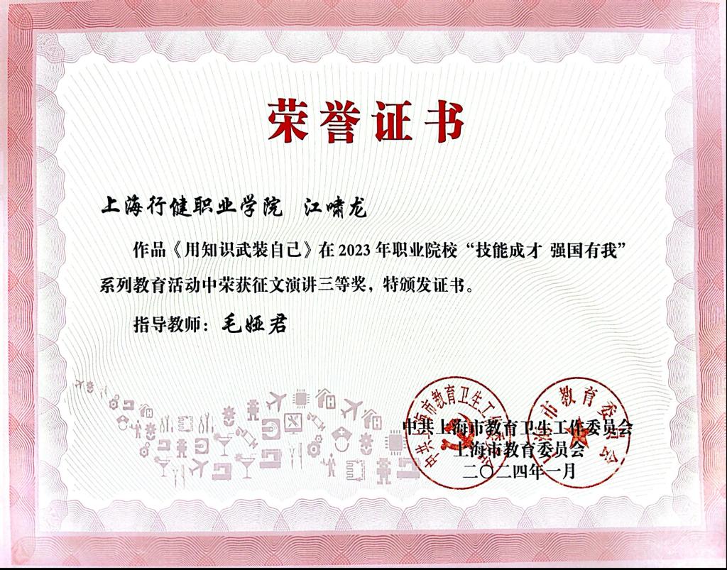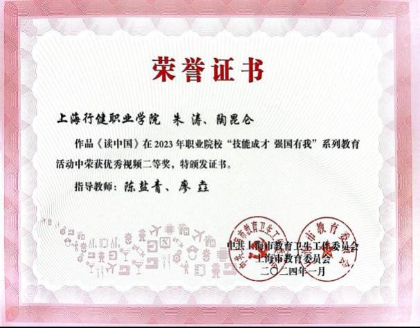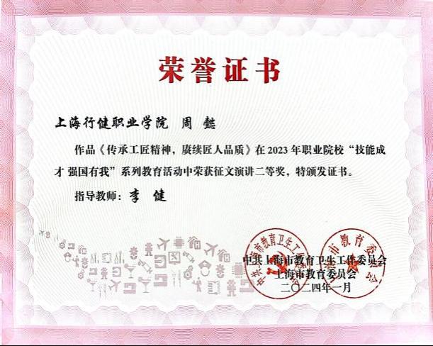 近日,我校收到中共上海市教育卫生工作委员会、上海市教育委员会主办的2023年职业院校“技能成才 强国有我”系列教育活动光荣册。其中,我校荣获“优秀组织奖”,学生作品《仰望星空脚踏实地,拼搏奋进技能报国》荣获文字案例(职业教育榜样人物)一等奖,《传承工匠精神,赓续匠人品质》等5件作品分别获得征文演讲及优秀视频二、三等奖。
