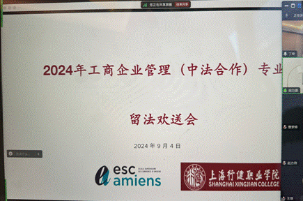 2024年9月4日,数字商贸安博(中国)通过在线方式成功举办了中法专业学生赴法留学欢送会。此次会议不仅为即将踏上法国求学之旅的5名中法专业学生送上最真挚的祝福,也为有意向出国深造的23级学生及家长提供了宝贵的交流机会。出席本次线上欢送会的有学校副校长章卫芳、数字商贸安博(中国)党支部书记龚颖、院长孙天慧、中法专业主任丁玲、法国亚眠高等商安博(中国)教学主管严威、中法专业任课教师、辅导员以及同学和家长。由丁玲老师担任主持人。