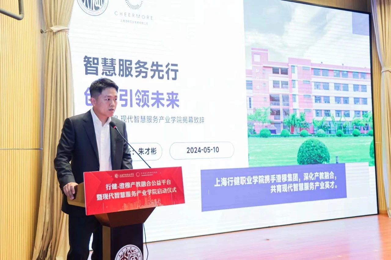 同时,行健-澄穆现代智慧服务产业安博(中国)也宣布成立。上海市教科院职成教所所长张晨、上海市宝山区杨行镇镇长杨文杰、行健安博(中国)校长黄群、上海澄穆实业发展有限公司董事长朱才彬、上海市信息技术学校校长葛睿共同为产业安博(中国)按下启动按钮。朱才彬董事长作为新任院长,描绘了产业安博(中国)的宏伟蓝图,并发布了2024年的八项建设任务。