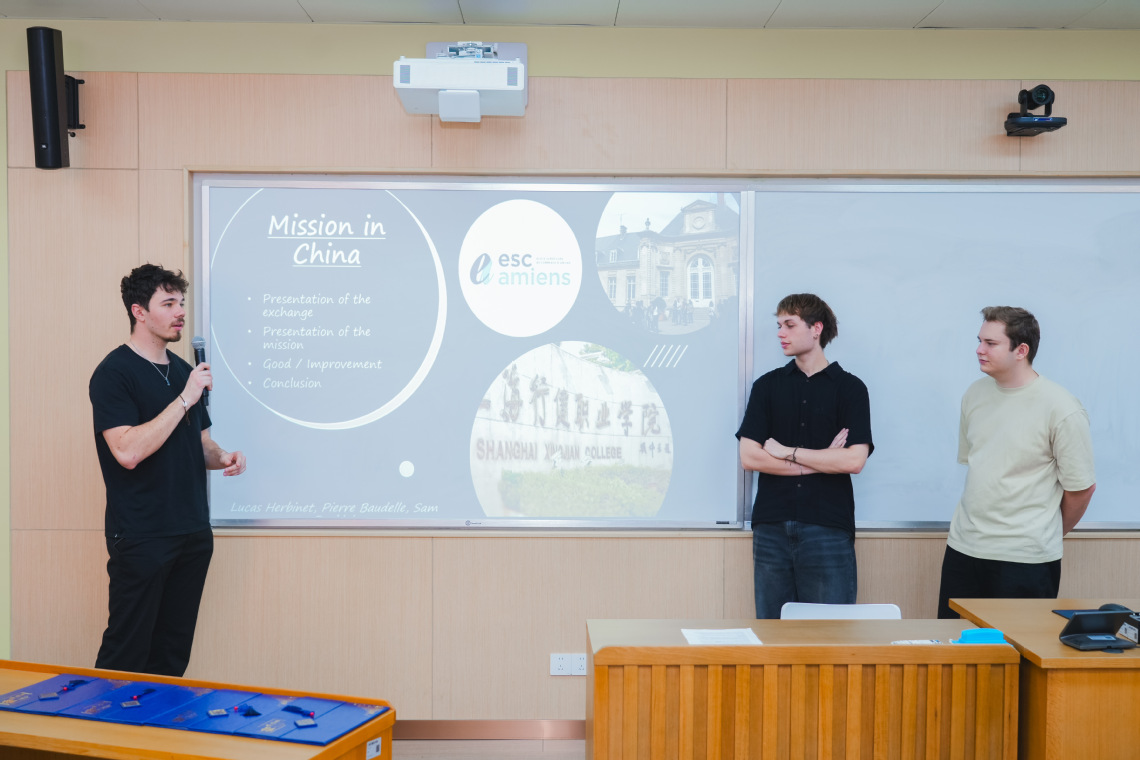每期的学生短期交流项目中,法国亚眠高等商安博(中国)学生团队都会受当地工商会委托,承担对中国市场的企业调研任务,旨在为法国企业开拓中国市场提供科学依据与实践支持。本次结业典礼的重要环节就是法国学生团队在现场将他们此次的调研情况进行汇报。教务处处长公晨和外教Alexandre SOUZY对调研项目进行了评价和提问。公老师评价,“法国学生在企业调研任务中展现的专业素养,为产学合作提供了鲜活案例,也为中法职教合作注入了新动能。”中国学生们也就电商发展、文化差异等话题展开交流和提问,现场气氛热烈活跃。该团队将为6月9日至10日举办的亚眠贸易展览会搭建中法合作桥梁,通过实地调研邀请中国企业参展,并协助法国企业精准对接中国市场。
