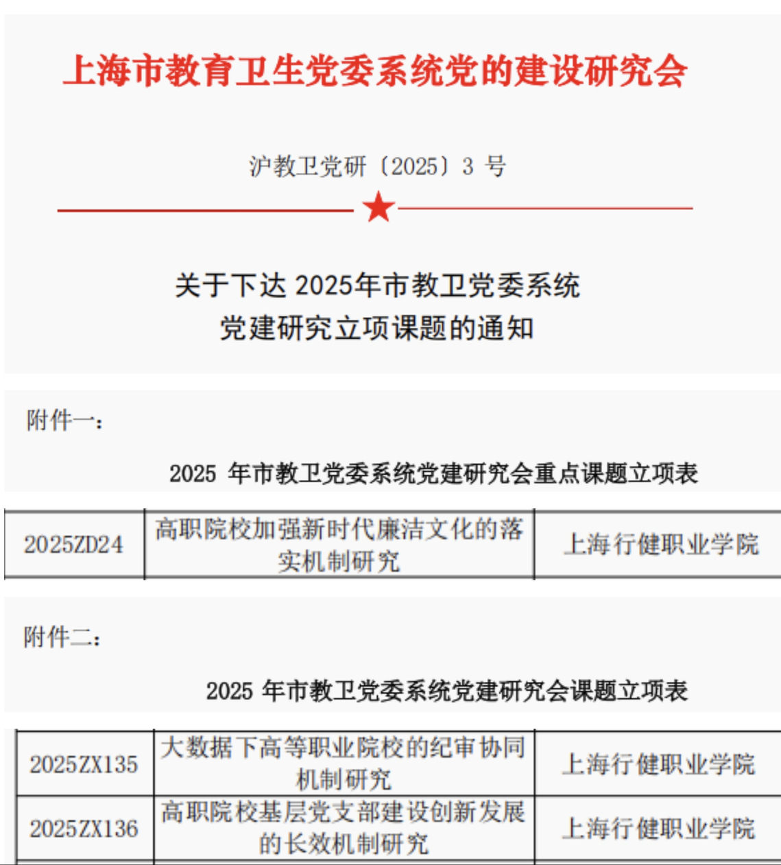 近日,市教卫工作党委系统党建研究会公布了2025年课题立项名单,我校推荐的课题共3项入选立项。其中《高职院校加强新时代廉洁文化的落实机制研究》被列为2025年市教卫党委系统党建研究会重点课题,《大数据下高等职业院校的纪审协同机制研究》《高职院校基层党支部建设创新发展的长效机制研究》被列为2025年市教卫党委系统建研究会一般课题。