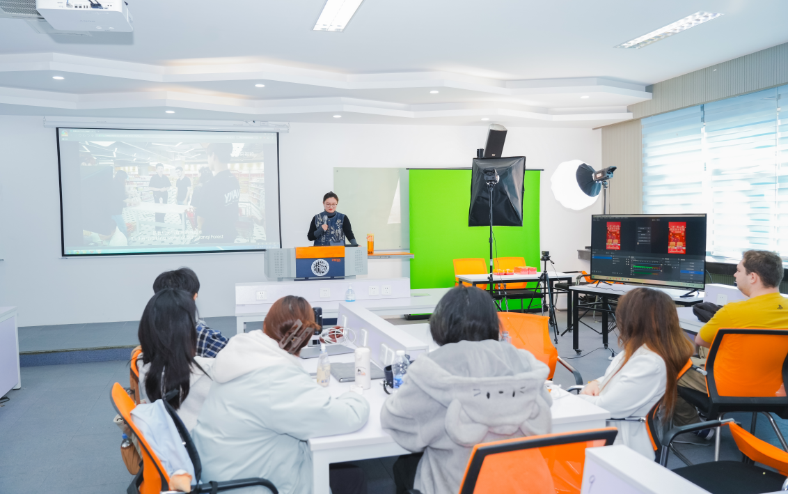 杜双双老师以“中国直播电商实践”为主题,为中法两校学生讲解了中国直播电商的发展历程、现状、相关工种及技能特点。通过精炼的讲解,让学生快速了解直播电商的核心要素。为增强实践性,杜老师把直播间搬进了教室课程中特别设计了中法学生合作“特色饼干直播专场”的活动,让学生们沉浸式体验选品、策划、直播全过程。通过实战演练,法国学生们不仅掌握了直播技巧,还深刻感受到中国直播电商的魅力。