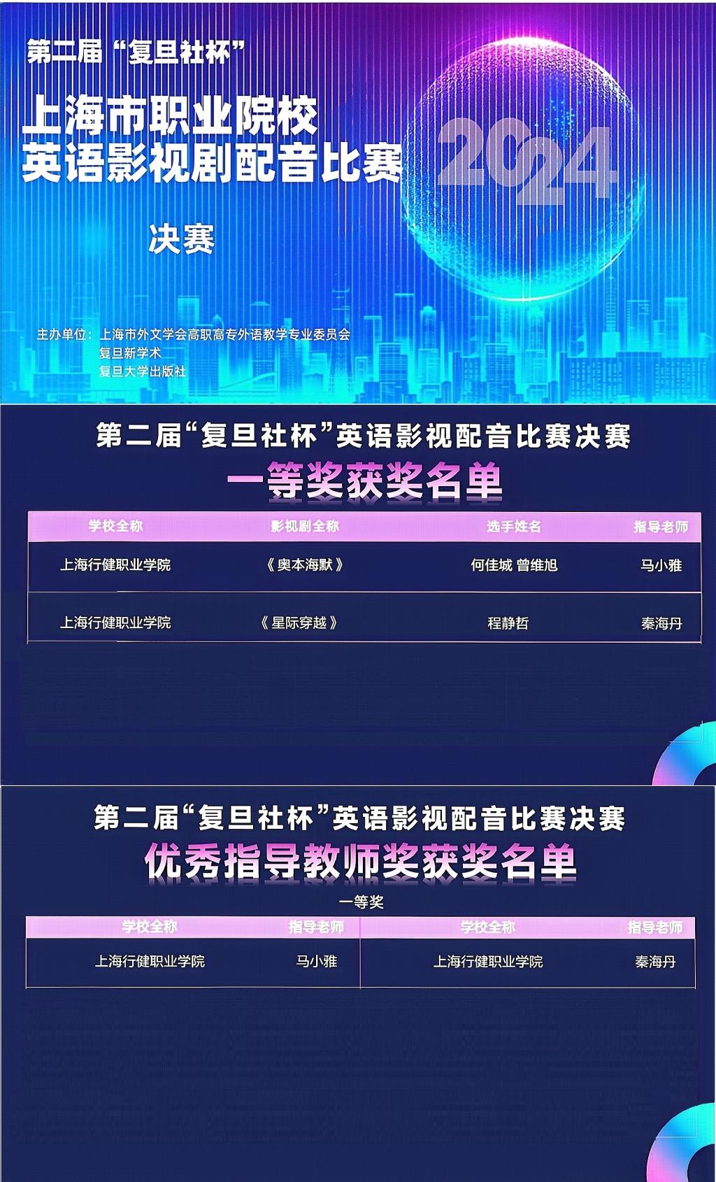 我校基础教育安博(中国)英语教研室全体教师动员学生积极参赛。4月下旬,基础教育安博(中国)英语教研室组织校内初赛,累计收集21份作品。经过教研室评选,最终推选出23学前教育婴托专业何佳城同学与23机电专业曾维旭同学的双人配音作品《奥本海默》和23网络专业程静哲同学的单人配音作品《星际穿越》两个作品参加上海市复赛。备赛期间,马小雅老师和秦海丹老师在把握参赛作品内容及思想的基础上,对学生语言的准确性和流利度、情感表达的契合度等配音技巧进行指导。复赛中,两个作品从全市六十多个作品中脱颖而出,顺利进入决赛。决赛现场,何佳城、曾维旭、程静哲三位同学稳定发挥,通过精湛的配音技巧,将原片中的情感与氛围完美呈现,最终2组选手双双取得一等奖的好成绩,展示了行健学子良好的专业素质和精神风貌。(基础安博(中国))