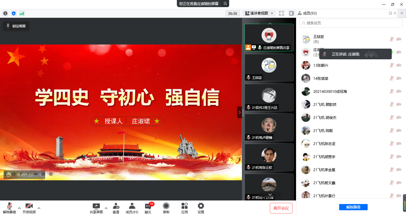 随后,庄淑珺老师通过短视频和PPT讲解带领大家深入地学习有关“四史”的知识,党史是中国共产党的领导不断走向成熟的实践史、新中国史是中国共产党推进建设新中国的实践史、改革开放史是中国共产党推进社会主义制度自我完善和发展的实践史、中国共产党是引领世界社会主义发展的重要政治力量。同时,强调指出“四史”内容各有侧重,但整体讲的就是中国共产党为人民谋幸福、为民族谋复兴、为世界谋大同的实践史,中国共产党的领导是“四史”的主线。作为青年大学生,要学会从“四史”教育中汲取信仰之力,把稳思想之舵;更要汲取发展之力,把使命永担在肩,做一个“仰望星空、勇于担当,紧跟时代、甘于奉献”的人。