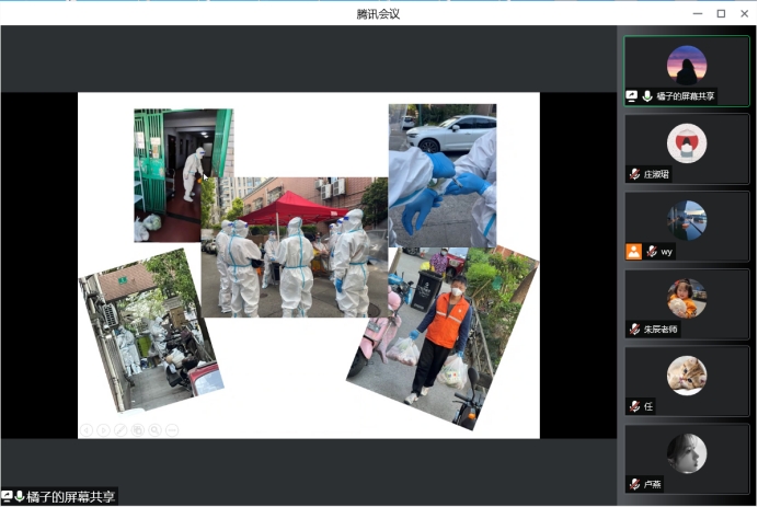 最后,信机系教学事务秘书柏婷老师分享了自己的抗疫志愿者故事。327日,柏婷老师在线完成党员社区双报到。329日,柏婷老师接到了街道党支部的电话,加入街道抗疫临时党支部,成为了一名党员抗疫志愿者。柏婷老师主要负责所在楼栋的志愿服务工作,包括:核酸检测秩序的维护、抗原、物资的发放、给有需要的人员配药、楼栋的消杀等工作。柏婷老师通过一个个小故事,号召所有老师关心楼里的孤老,关心小区的流浪小动物,团购生活必需品,减轻志愿者的负担等等。“我个人力量有限,但是我想尽自己所能,传递这份关怀和温暖,众人拾材火焰高,希望上海疫情早日得到控制,我们在校园再相聚。”