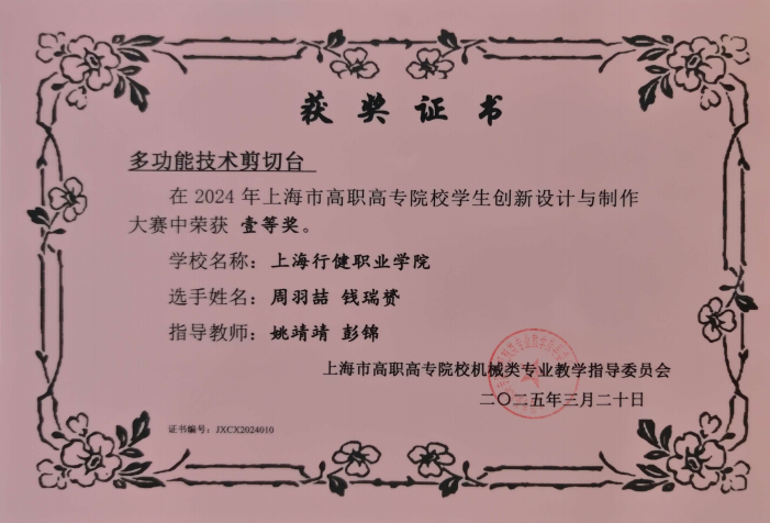 由上海市高职高专院校机械类教学指导委员会主办的高职高专院校学生创新设计与制作大赛,我院学子周羽喆,钱瑞贇在姚靖靖、彭锦两位老师的指导下,立足教学、生产、生活实际,以技术革新和创新为重点,突出应用性,围绕环保节能理念,设计的《多功能技术剪切台》作品,在比赛中脱颖而出,荣获大赛一等奖。